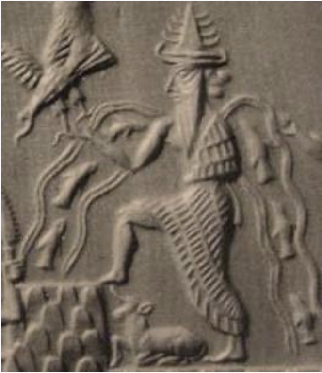 Herunder, ENKI afbilledet på et cylindersegl fra det 3.000 år yngre akkadiske rige. Dateret til cirka 2.300 før vor tidsregning.